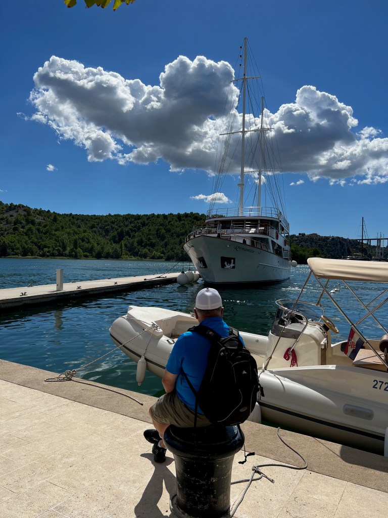 We had a bit of a gelato-fuelded wait back in Skradin. We watched other groups being transported back to their ships on small tenders and wondered if that would be us at some point. Finally a large, rather garish yacht pulled away, leaving a large enough spot for Romantica to dock. We had 10 minutes for a super fast load and pulled away about 30 minutes later than planned. (We are at 2 speedy loads in a 2 day period. Is this an emerging pattern?)