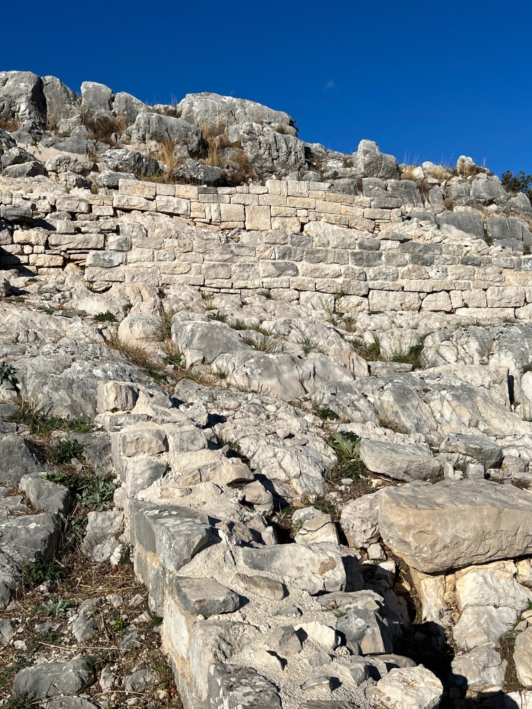 A large cistern at the bottom of the hill was the first discovery, followed by walls and building foundations progressing up towards the top of a hill. Although the walk from the bottom to the top was not long, it was steep and exploring the top sections required the confidence of a mountain goat.