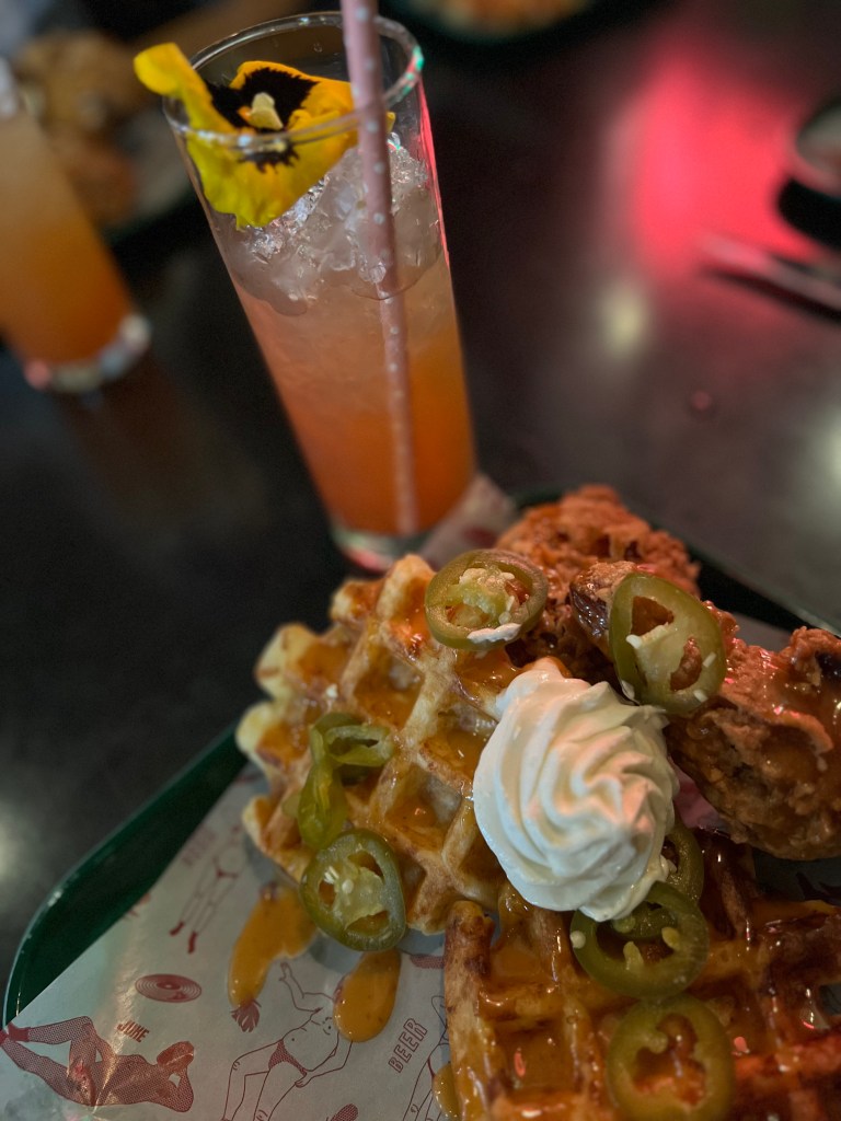 At some point, between cocktails one and two, we had placed our brunch order. The options were few but that just made ordering easier for me. as I am always struggling to choose between a couple of options. Aaron, Raquel and I landed on the chicken and waffles, which I have never, ever had before. Rick opted for the banana-stuffed peanut butter drizzled waffles. Perhaps an ode to Elvis?