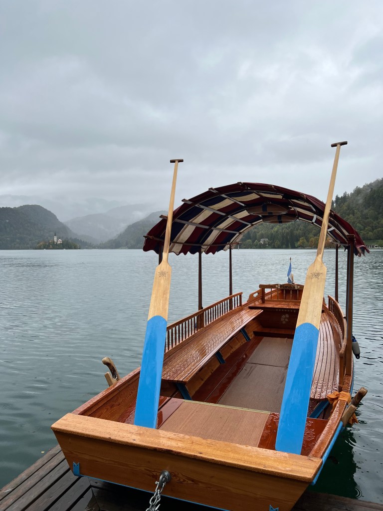 These boats are pletnas and the most common mode of transport to the island. Given the weather, we ended up in a small electric boat. It was fully enclosed, preventing us from getting any wetter than we already were.