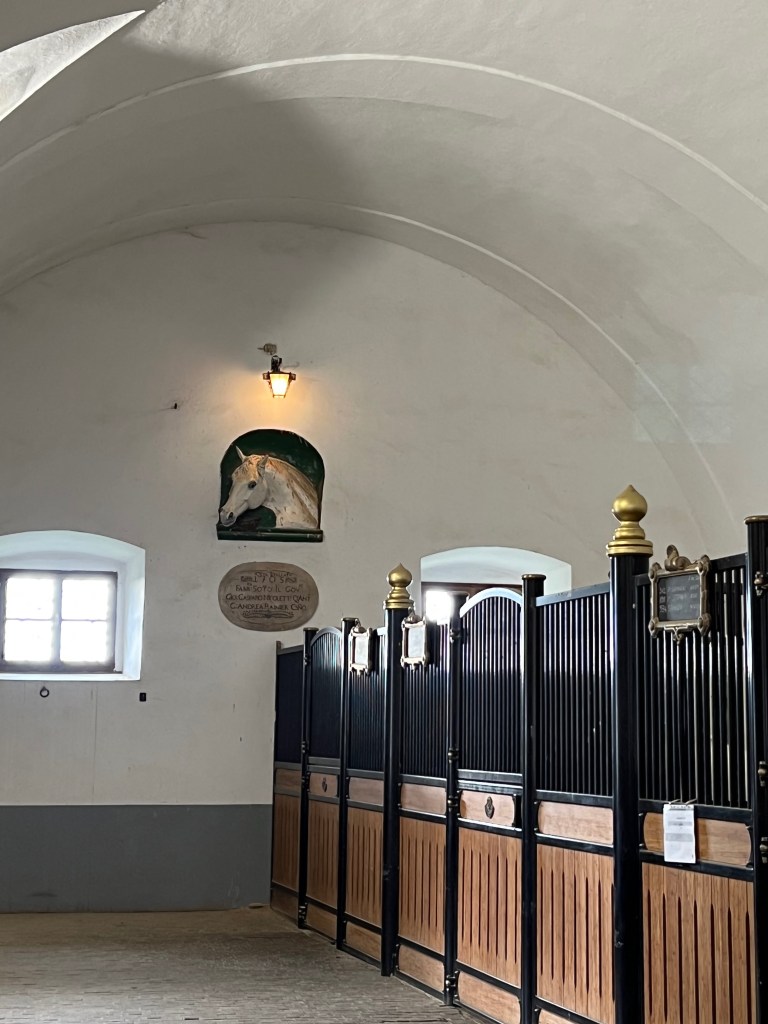 The farm is 300 hectares, with multiple training rings and stables. When we entered the property the first thing we saw were the stables where the mares and foals are kept, a delightful intro. Lipizzan horses are born black or dark grey, then gradually change to white over the course of six or seven years. The photo below is a mom and baby, only about four months old.