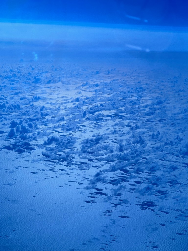 I read a bit, did not sleep a wink, or even doze, and ate in very small quantities from the frequently offered meals and snacks. The only thing that really temped me was a hot chicken pot pie. Since they brought it around only 3 hours after eating dinner – I guess I wasn’t really that tempted. I did drink gallons of water and green tea which caused me to leave a path in the carpet between my seat and the washroom.