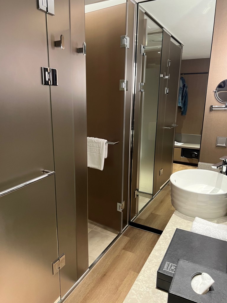 My hotel room is fine. The bed is big and comfortable (I will be climbing into it momentarily). The bathroom is really a space with a couple of little cabins holding the toilet and the shower.