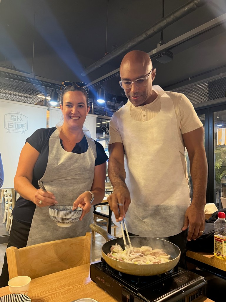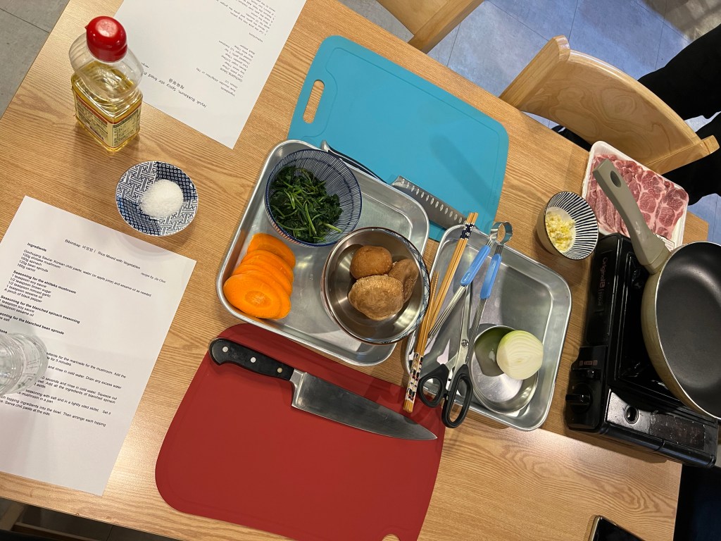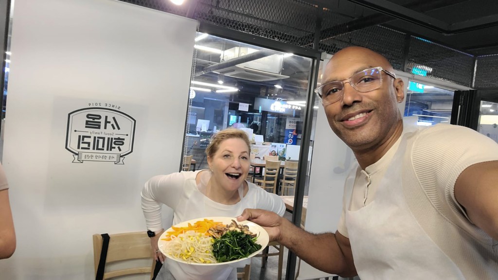 Places had been set and some of the ingredients prepared for us in advance. We were going to make bibimbap (rice with vegetables) and jeyuk bokkeum (spicy fried pork). The chef was great and we managed to pull off a pretty decent version of the meal. Jessie, our local guide, returned to our pan of spicy pork more than once saying it was the best in the class. She wasn’t wrong – it was definitely the crispiest and that seems to be the trick.