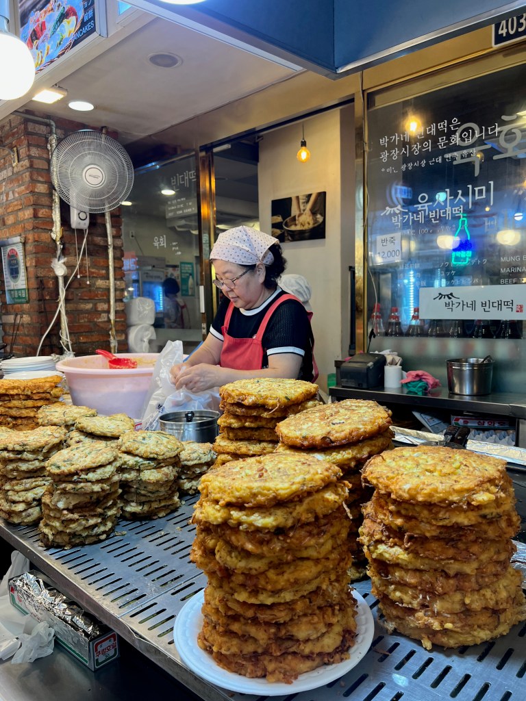 Lunch had been arranged for us at a small restaurant just above the market. They specialized in mung bean pancakes which are famous in the Korean food scene. You can see stacks of them in one of the photos above. They are a celebration food and in high demand this time of year as Korea is celebrating the 3 day Chuseok holiday this weekend.