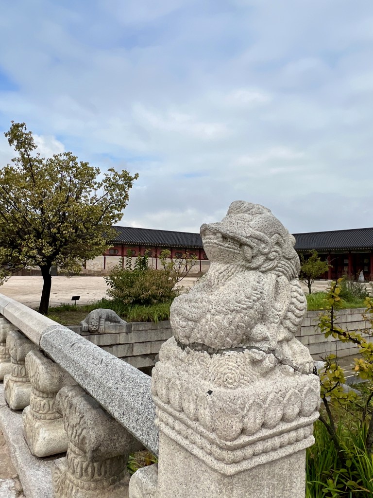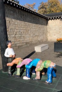 Lunch done, we piled back into our mini bus and 15 minutes later arrived at Gyeongbokgung Palace. But not before passing this somewhat alarming statue of children playing a “popular Korean children’s game”.