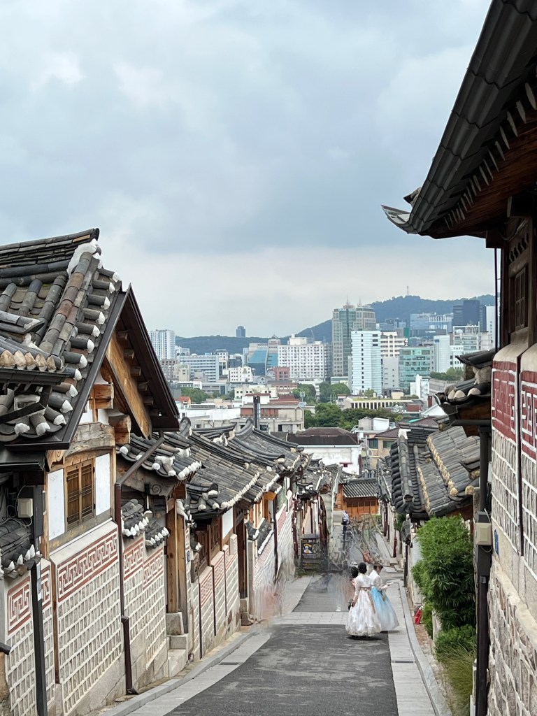 Back in bus, another 15 minute drive, and we arrived at Bukchon Hanok Village, home to hundreds of traditional houses, hanok, that date back to the Joseon dynasty. The homes are still in use, and the government offers subsidies to encourage people to live there and maintain the buildings. It was a very hilly walk along narrow streets, but very beautiful well worth the effort.