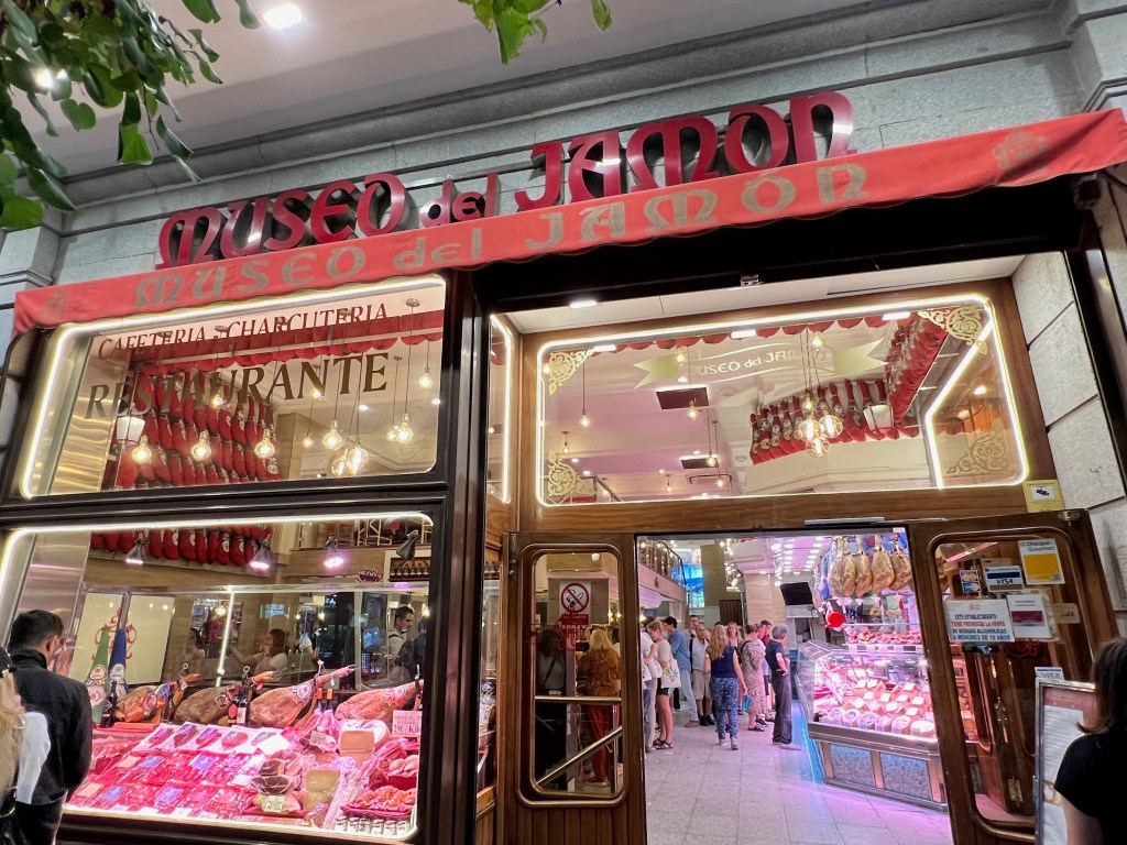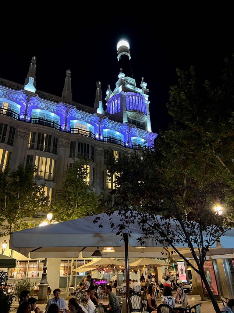 We popped into the Mercado San Miguel, which I remembered fondly from my most recent trip to Madrid (2019, pre-COVID). The market was jammed, noisy, and standing room only. Of course it was a Friday night, and there were still a surprising number of tourists about. We eventually agreed it was too much for the first night, but we would at a return at a future time, more rested.