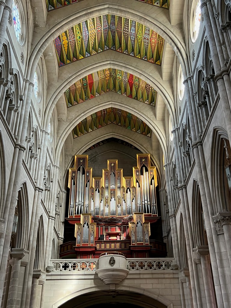 In spite of first appearances, it is a very new cathedral. We loved the beautiful ceiling mosaics and the very simple stained glass.