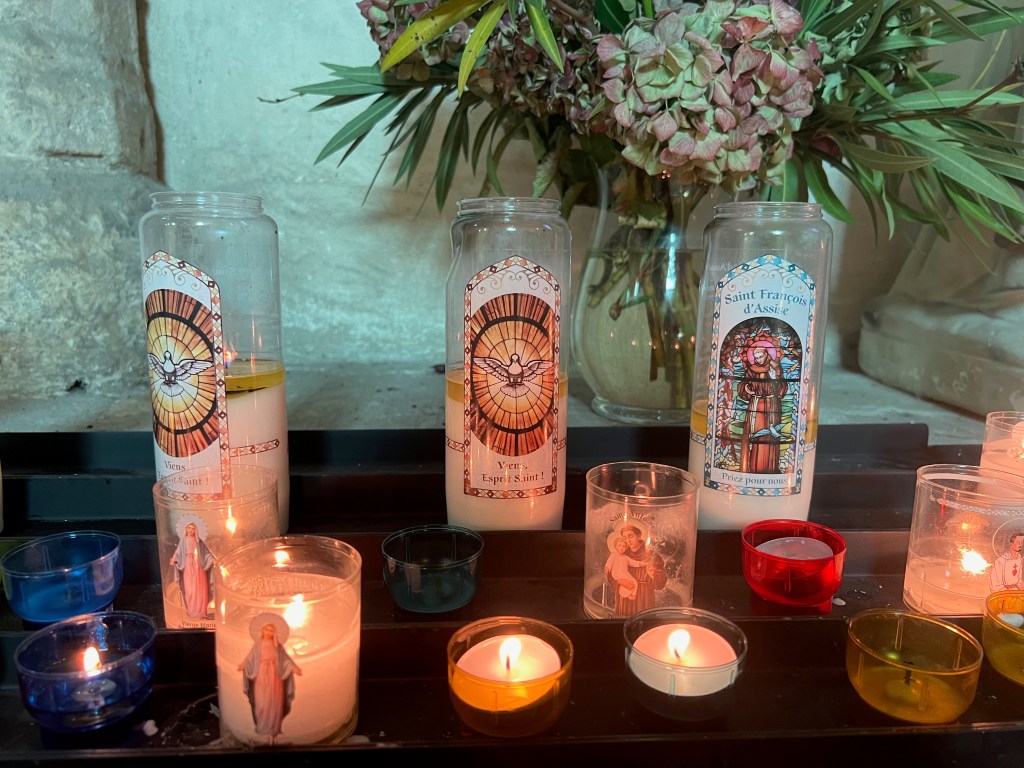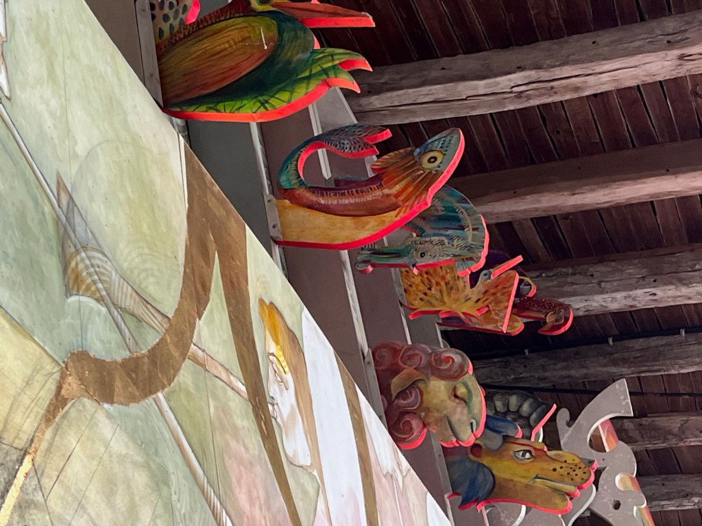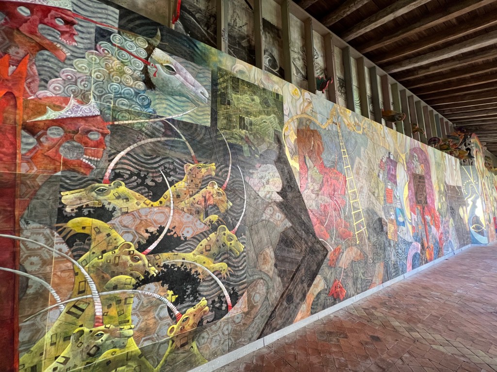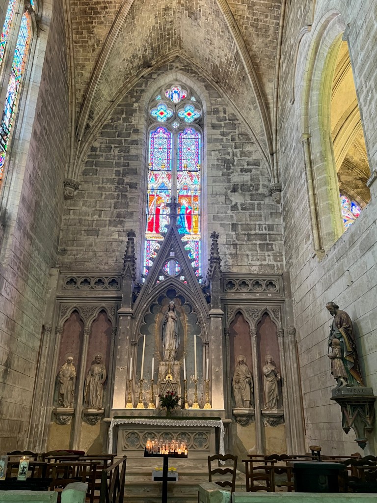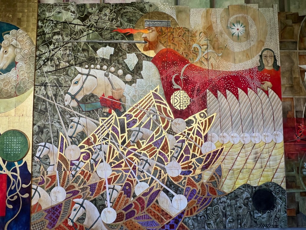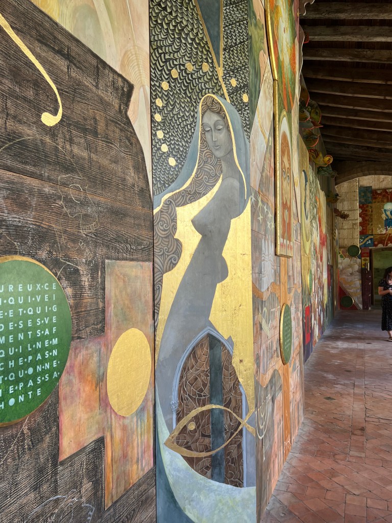 After lunch, while in search of a washroom, we ended up in the church cloisters of Collegiate Church, originally built in the 1100’s. It has since been enhanced by the addition of stunning artwork in the cloister: “The Apocalypse” by the painter François Peltier. It is 38.5 metres long and 5 metres high, and took 2 years to paint (2015-2017) using 5 different types of woods: lebanese cedar, oak, chestnut, lime and poplar. The set of paintings was conceived as a whole and not as a succession of paintings. I would try to tell you how impressive it was, but a few photos will hopefully tell that story better than I ever could.