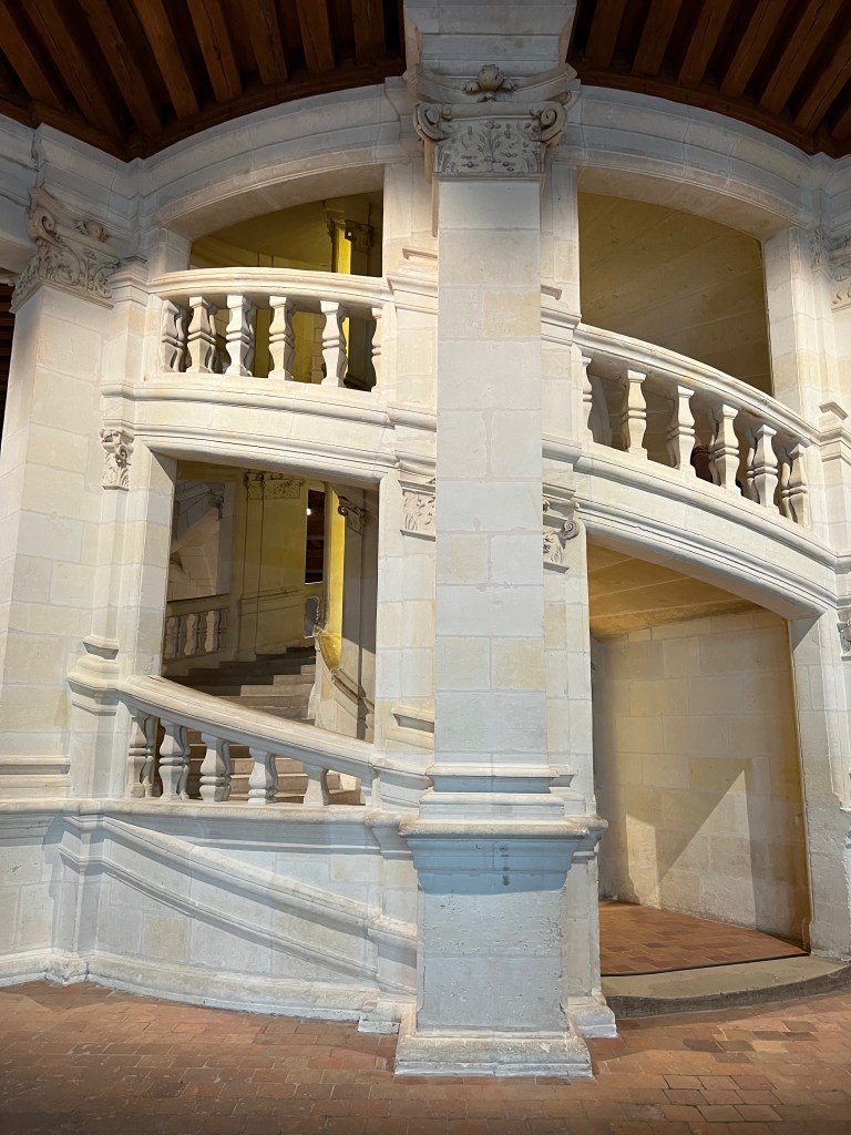 The most intriguing feature is the double helix staircase in the centre of the chateau. We tested it, as did many of the other visitors. Rick stood in place on one of the staircases, while I came up the other side. We could see each other by peeking through the openings, but never passed.