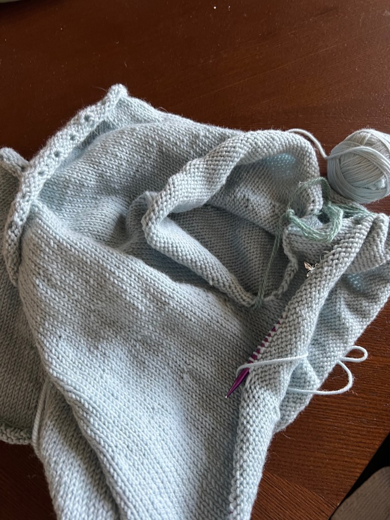The body advanced relatively quickly and I was pleased with my progress. Until it was time to take the armholes off the needles to be held for the future sleeves. This step was necessary before I could continue with the body.