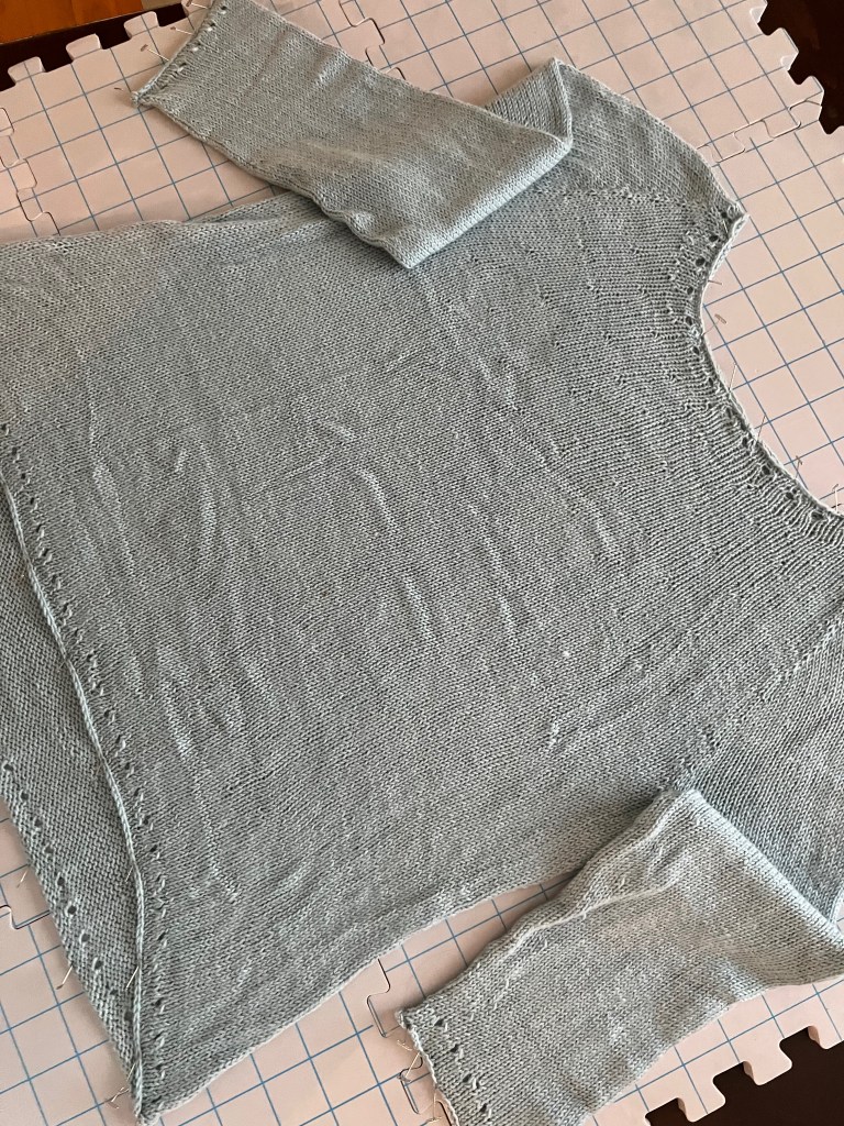 So, rather then balling it up in a bag, I carefully unpicked the castoff and the flawless eyelet, and ripped out 5 inches of length. I cannot tell you how much it hurt me to do that. Once I committed – it wasn’t too bad. One week later I was done and a week after that the sweater was blocked and dried.