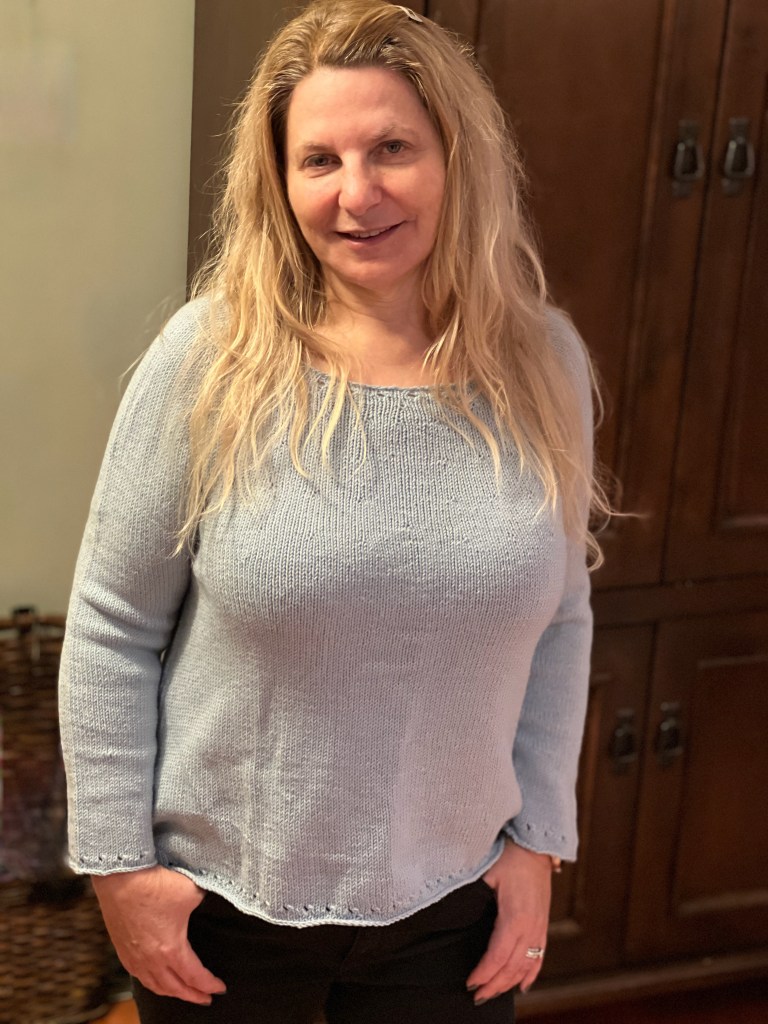 I had a number of false starts selecting a pattern and the yarn. I started an online course, but quickly realized I was not up for the complexity of a cardigan that required many pieces and full assembly. Truth be told, I have never really mastered the mattress stitch required to seam all the components. I knew once the enjoyable knitting was complete there was a high probability the pieces would sit in a bag for a year or more before I rallied myself to stitch it all together (if ever).