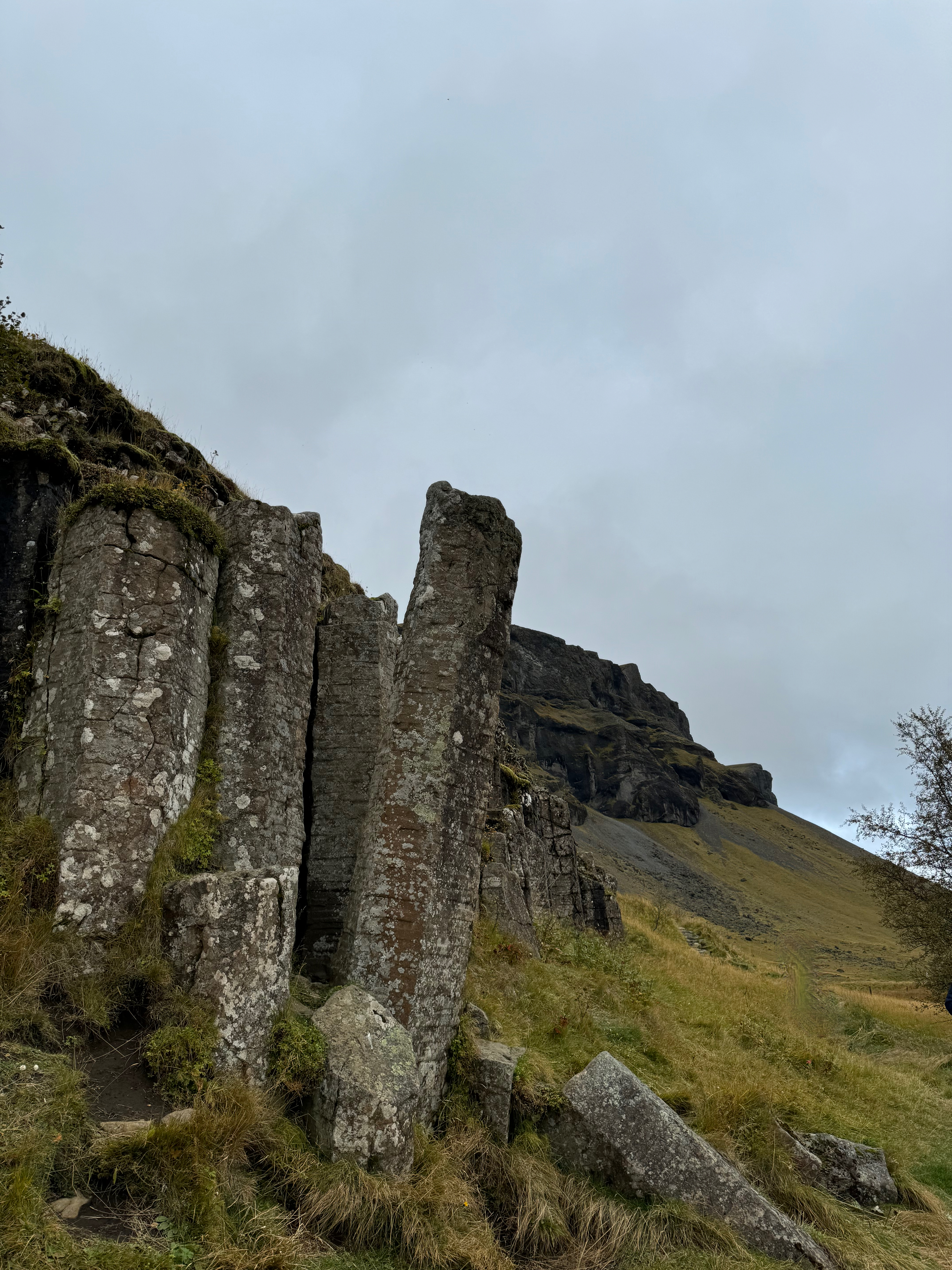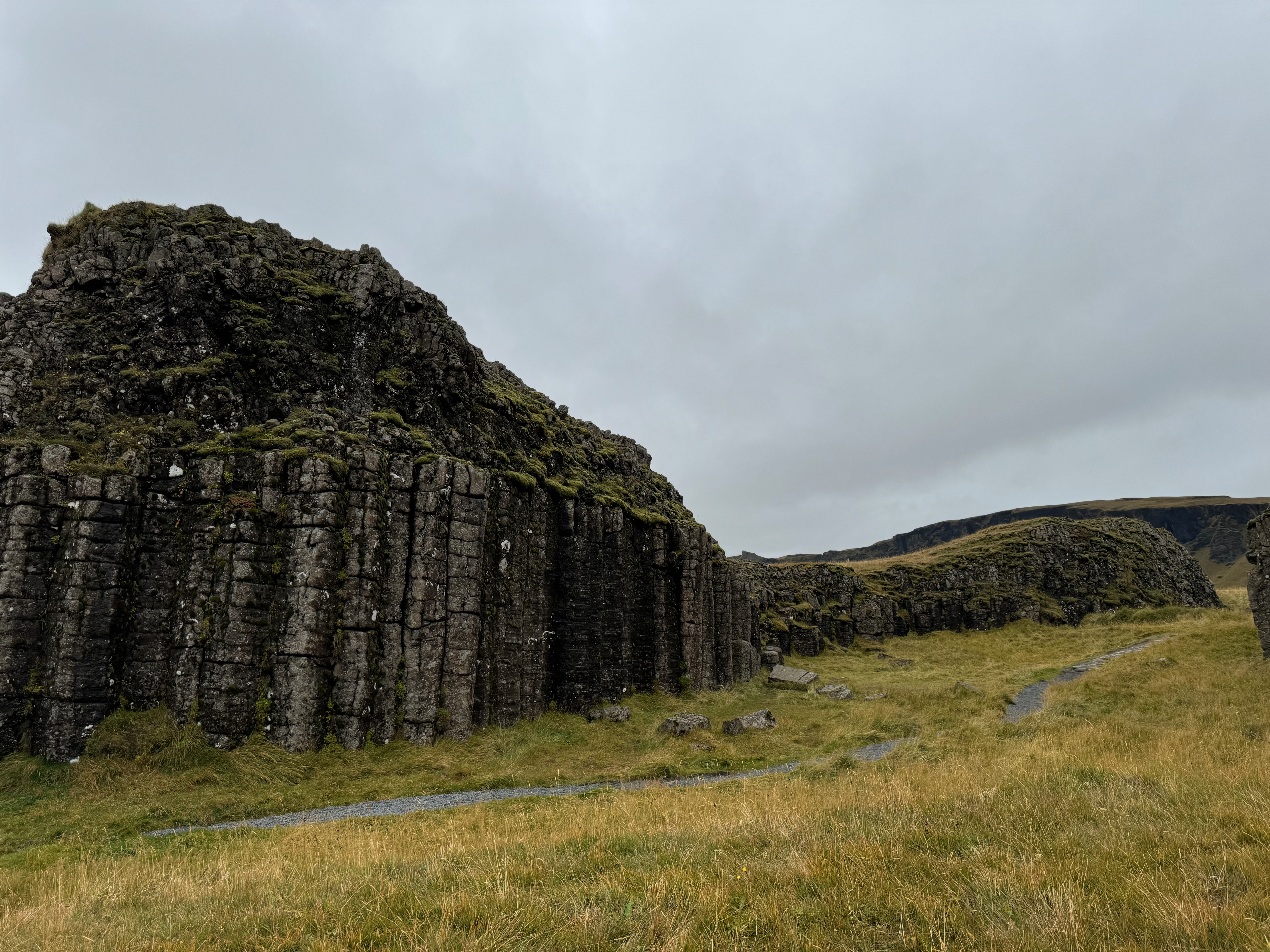 Next we had a very brief stop at the the Dverghamrar Cliffs. According to local myths and legends, dwarfs live within the cliffs — that’s why they’re known as the Dwarf Cliffs. It is quite a pretty location with basalt columns and a nearby waterfall.
