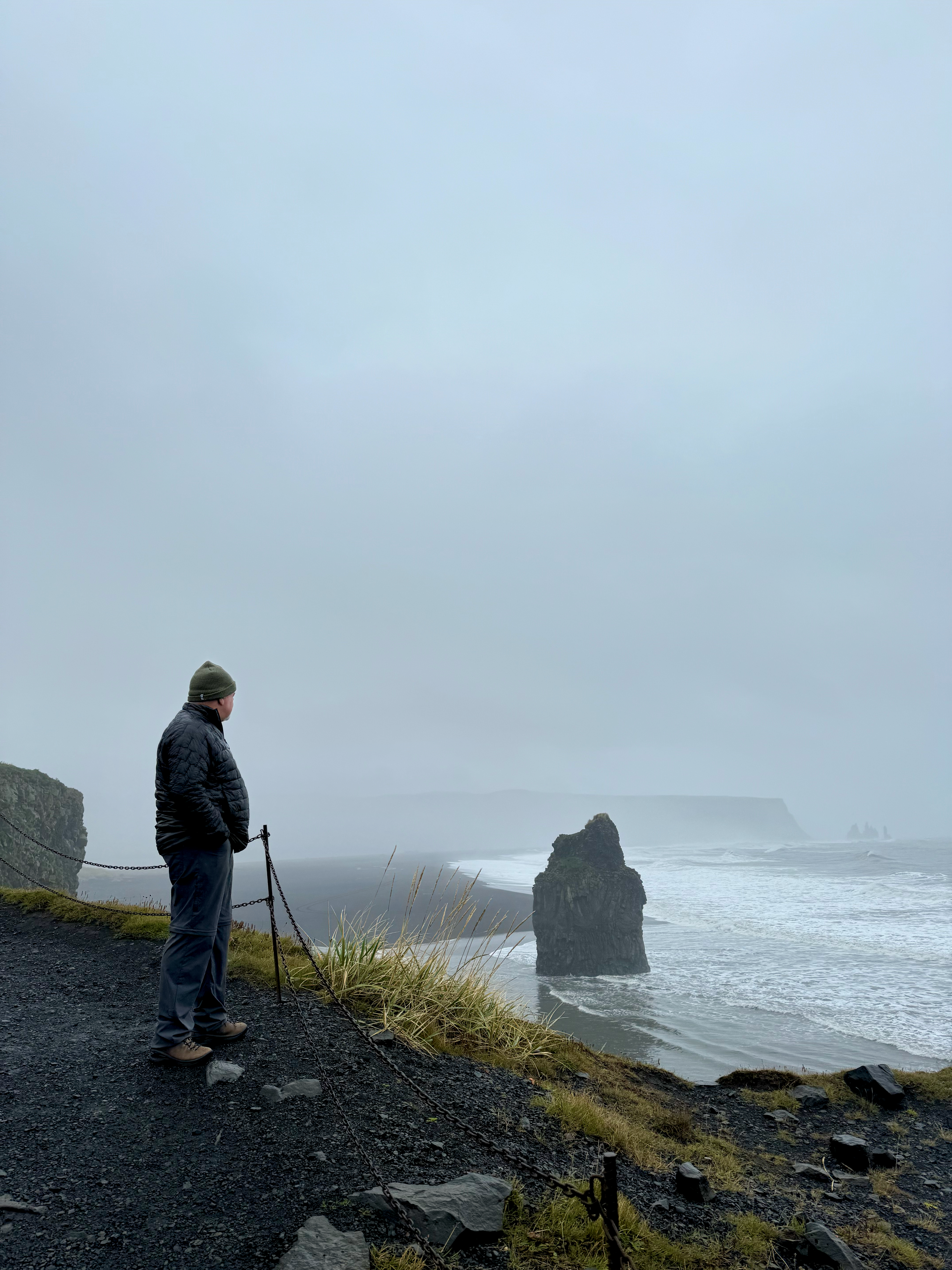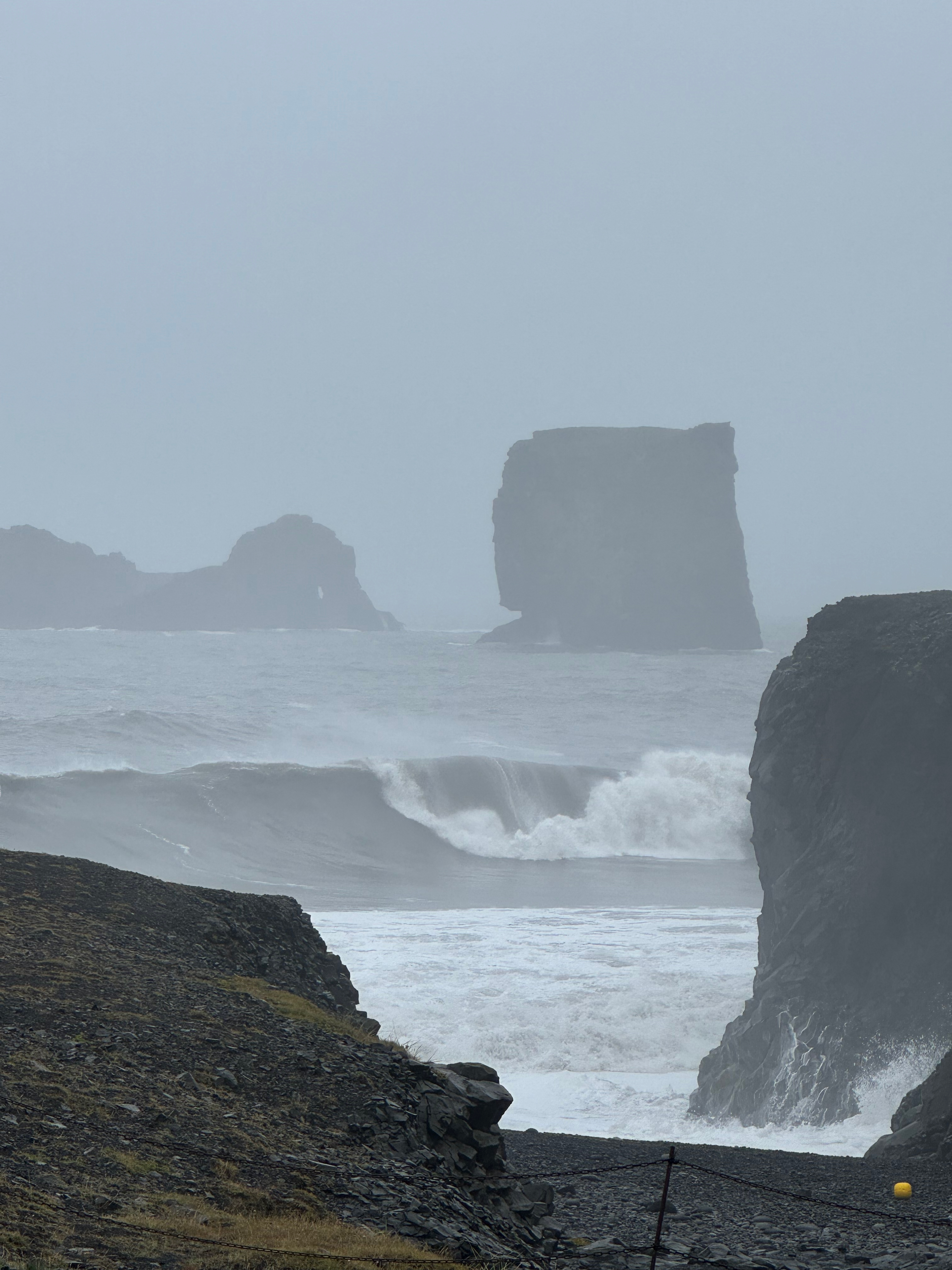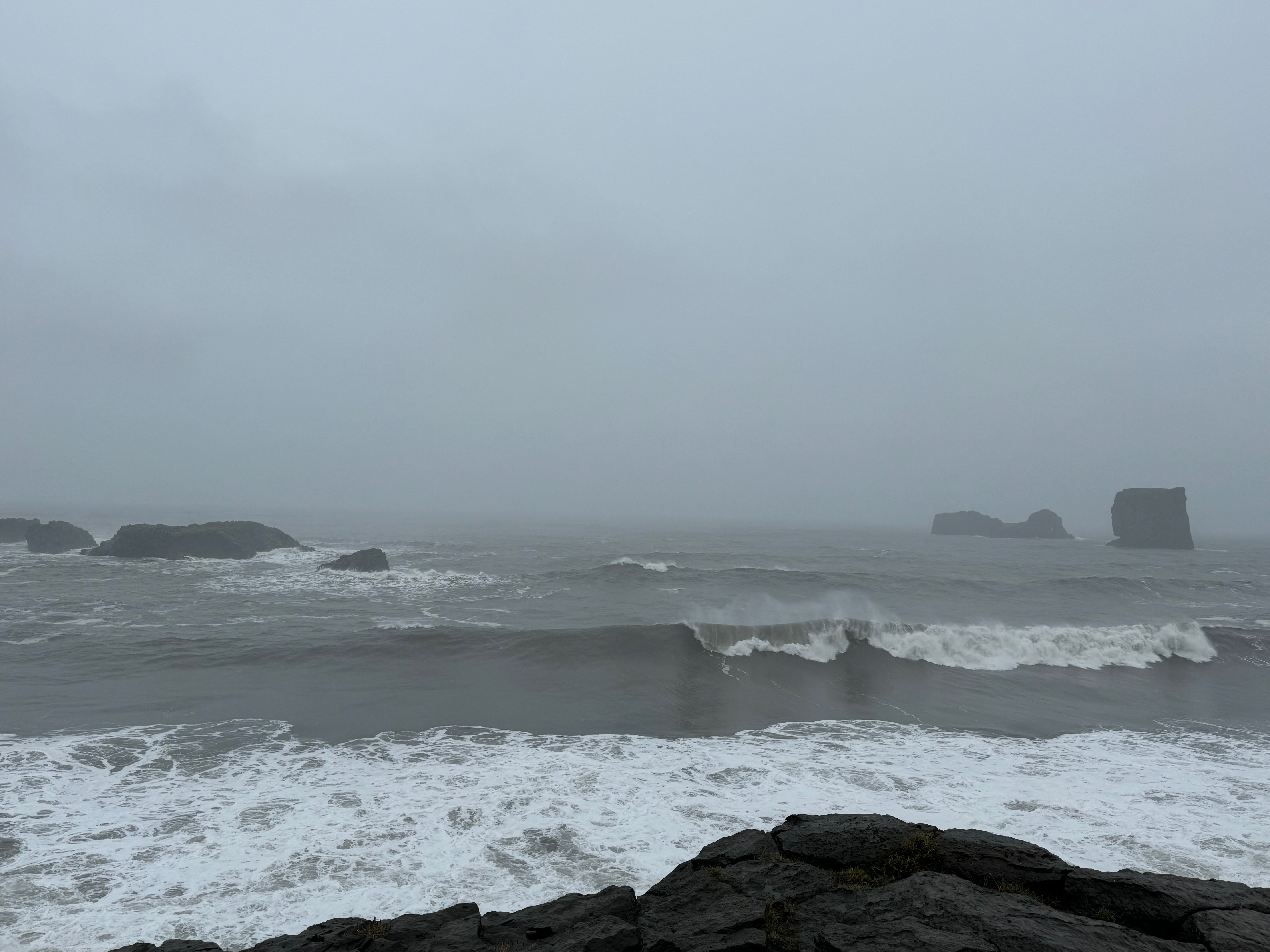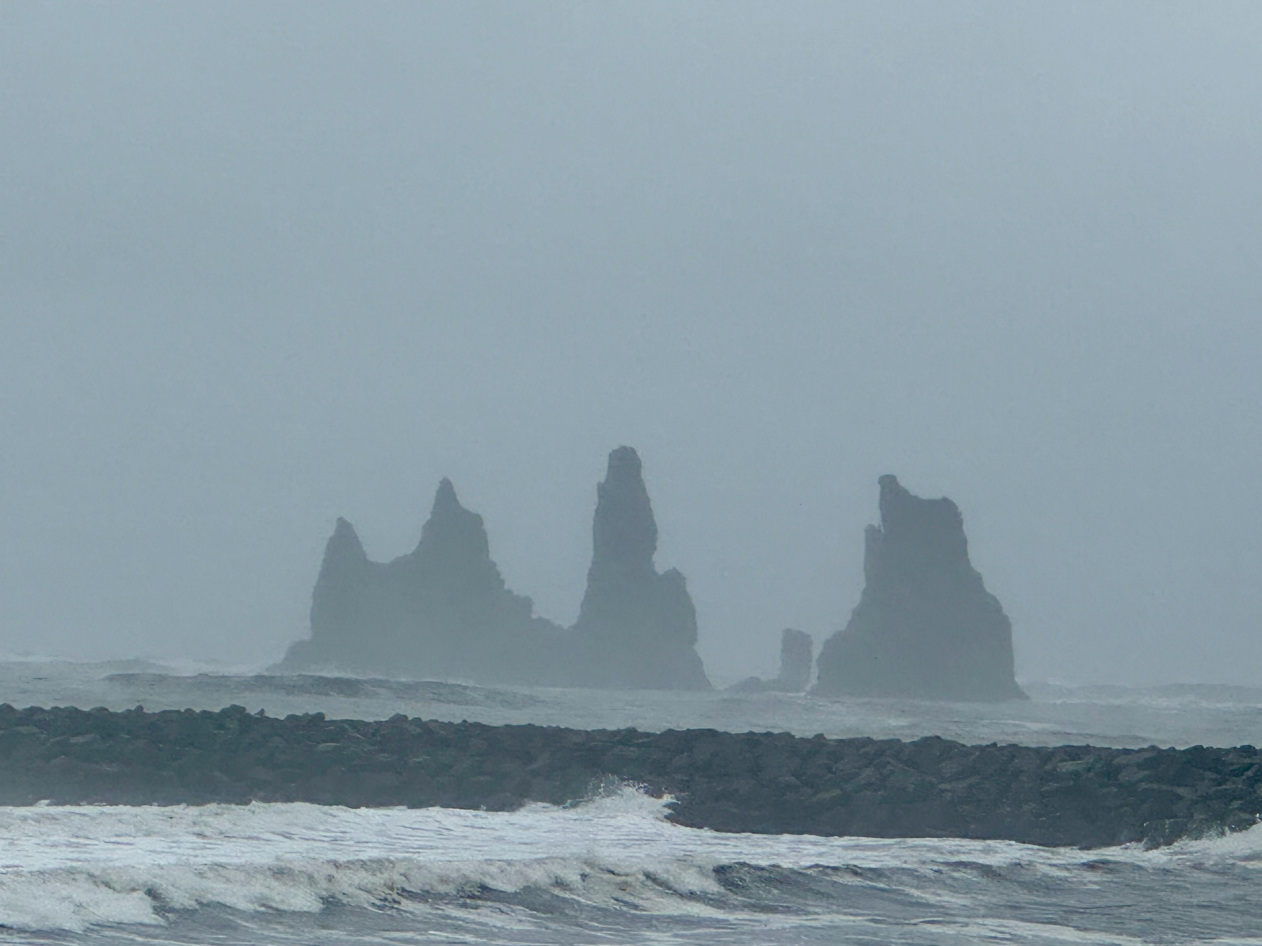 We made a brief comfort stop near Vik and there was an mysterious looking troll ship visible in the distance. The waves were very intense and the wind was howling. It was all quite eerie.