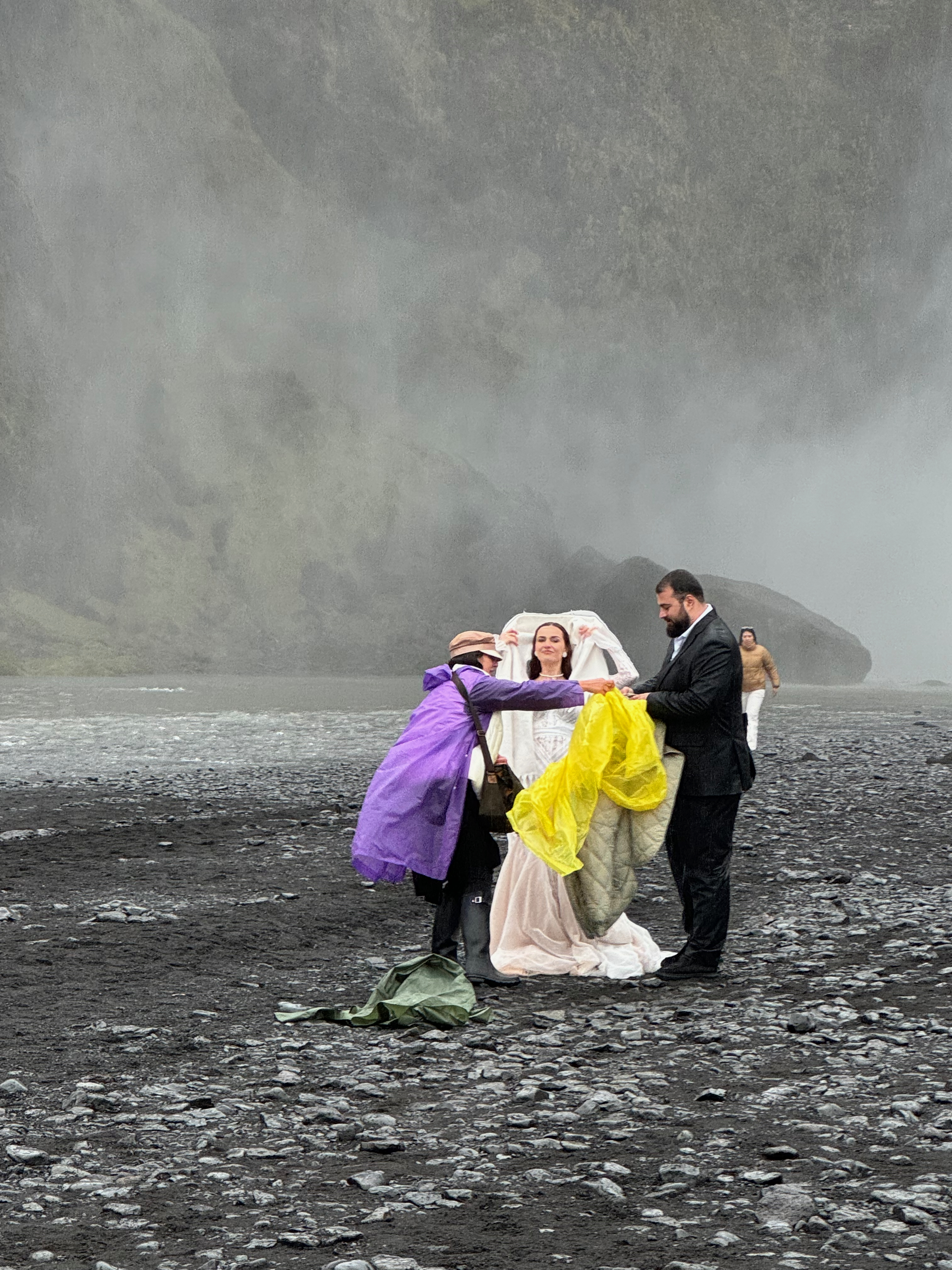 Seljalandsfoss a lovely waterfall made slightly more intriguing by the fact that you can actually walk behind it. Which we did. Even with the heavy rain, we watched a bride and groom being photographed in the chilly weather. I think the falls actually threw off more water than the rain and it was quite cold out there.